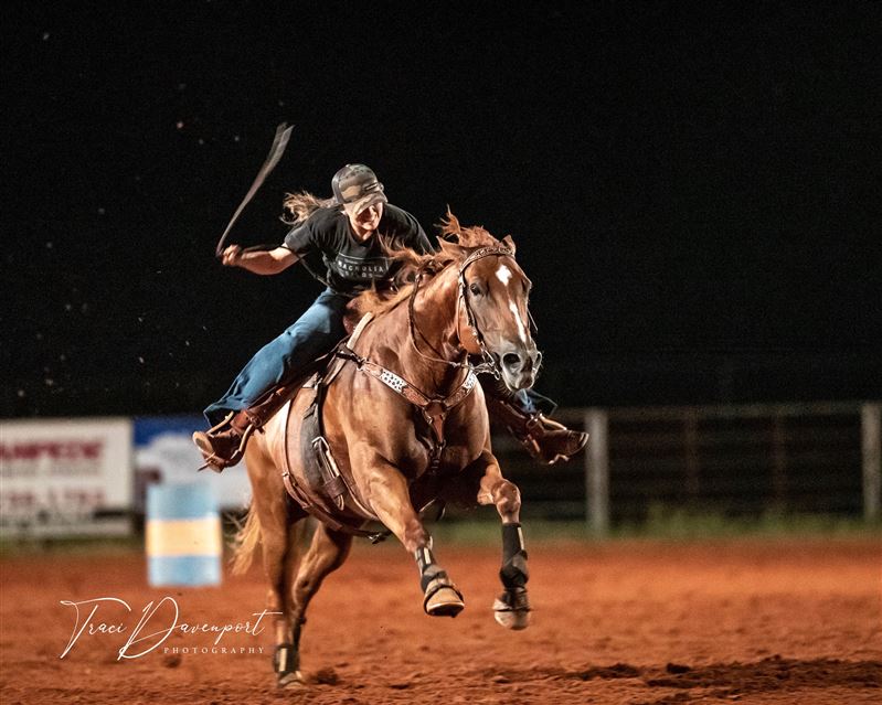 I’ve owned this mare since she was 3. She is solid, honest, consistent, and all business every single time. She is 2D/3D, and runs in a Flaharty hack. She can be energetic to ride around, but stays in your hand. Goes in the gate great, and will wait on you. She doesn’t do stupid stuff, therefore isn’t going to tolerate stupid stuff either. She’s pretty simple. Keep her in shape and go- very minimal tuning ever needed and it’s at a walk/trot if so. She has been to rodeos, handles any set up you throw at her. Can go right or left, she has gone to the right the majority of her career. I’ve only made a handful of runs the last 5 years, otherwise she has been sitting. I feel like she will be best suited for an experienced jr/hs or college girl that needs something solid and that can stand up on anything. She is a really nice mare- I’ve completely gotten out of the horse industry, and would love to see someone else go on and excell with her.