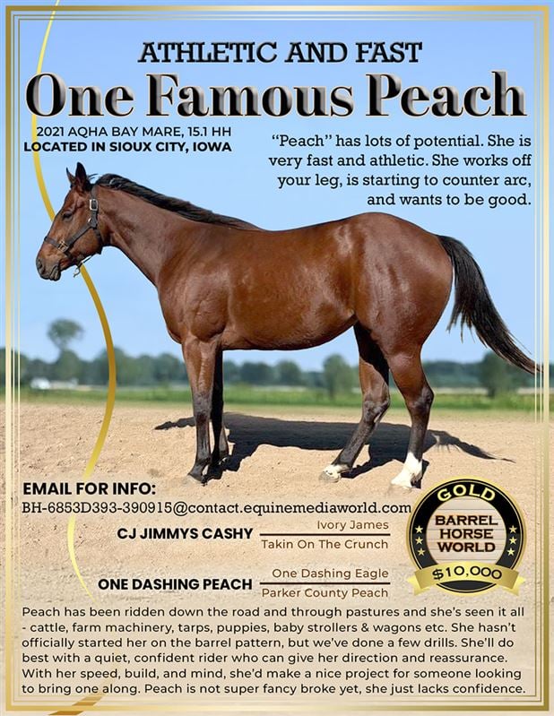 “Peach” is a 4-year-old mare with lots of potential. She’s not super fancy broke yet, but she works off your leg, starting to counter arc, and wants to be good but she just lacks confidence yet.