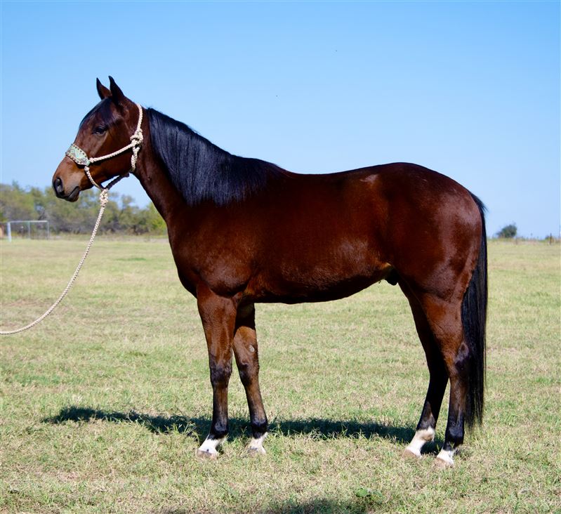 He’s gentle, smart, and ready to go on with. A fantastic prospect for someone wanting to put one to work—ranch, rope, barrels, or show—he’s got the mind, the movement, and the looks to go any direction. He is very easy going to be around and has a cute personality to him.
