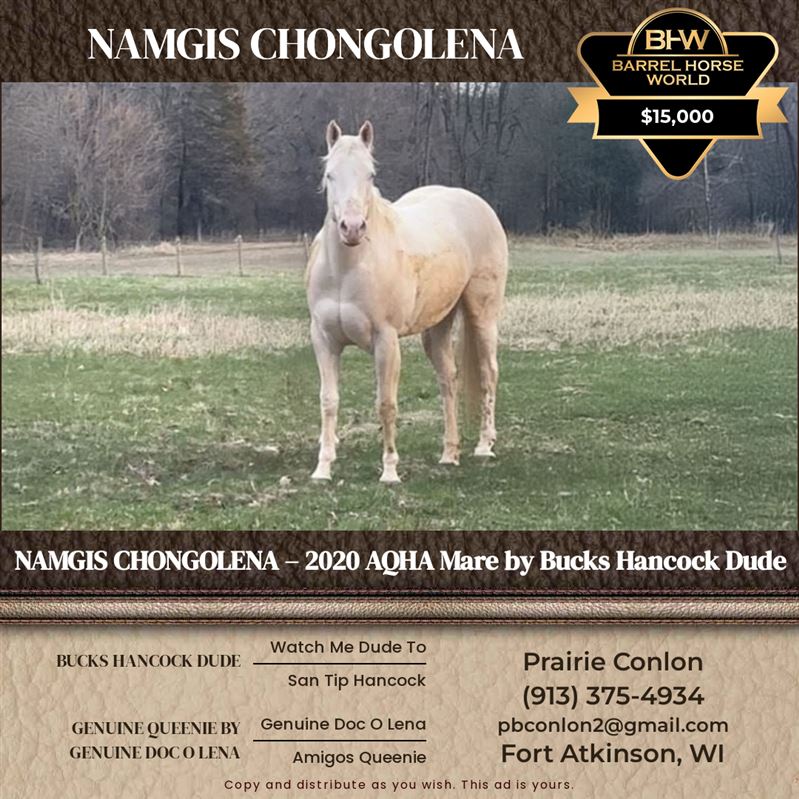 “Snow” is a gorgeous 2020 perlino mare with blue eyes, proven performance bloodlines, and guaranteed color production. Sired by Bucks Hancock Dude, a $1M+ producing stallion known for barrel, rope, and ranch versatility, and out of a Genuine Doc O Lena mare, she’s bred to run and built to last.