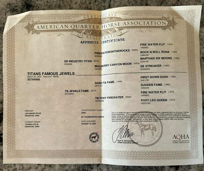 Titans Famous Jewels is a very classy 2 year old filly that is sired by SR Industry TItan and out of a mare who is a 100% 1D producer.