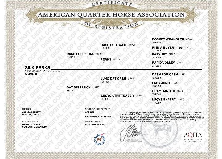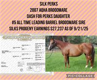 2007 AQHA Proven Broodmare. Foaled in 2024. Dash For Perks is the #5 All time leading barrel broodmare sire. There are not many DFP daughters left. Barrel Producer of 3 money earners! With two more still to hit the arena. Producer of nearly $28,000 and growing! Last picture taken 12/20! Just lavaged her and cleaned up for the new year.