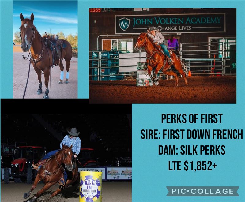 Perks of First - 2013 Sorrel Gelding by First Down French. 2017 6th Classic Equine Open 2D $572, 2017 6th Classic Equine Futurity AM $121, 2017 3rd NBHA AZ New Years Bustin Out Futurity rd 2 open 2D $146.