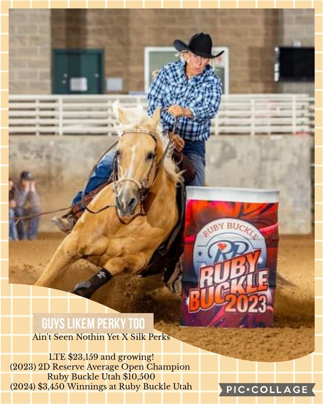Produced - Guys Likem Perky Too - 2015 Palomino Gelding Sired by Aint Seen Nothin Yet. This guy is exceptional! LTE $23,912 and growing. Magic Cross! 2023 Reserve 2D Open Champion at Ruby Buckle West Open ($10,500), 2023 Ruby Buckle West Round 1 open 1D ($2,062), 2023 1st Xtreme AZ Mini Million Open 3D Sidepot $4,750, 2023 4/5 Xtreme AZ Day 2 open 3D $730. 2024 11/12 Ruby Buckle West Rd 1 Owner/rider sidepot open $262, 2024 9th Ruby Buckle West open 2D $2,626, 2025 5th Xtreme Cedar City Classic day 2 open 2D $640.