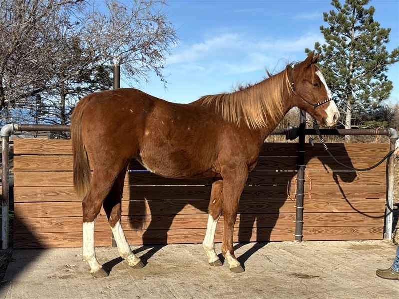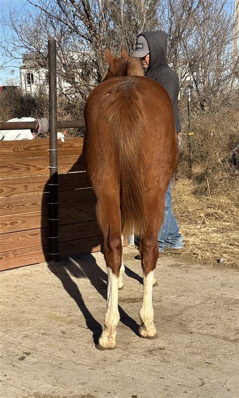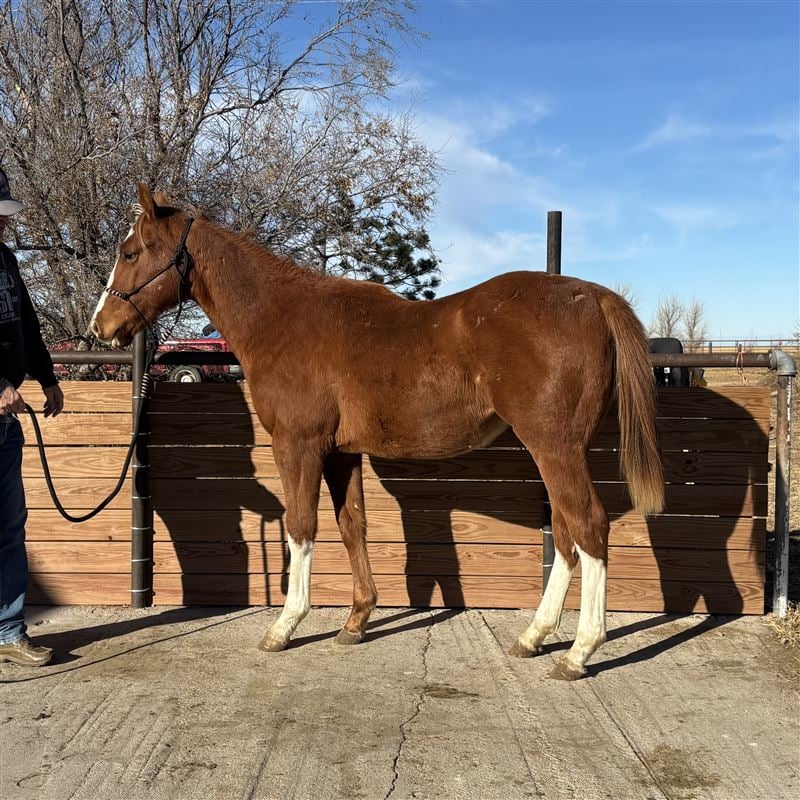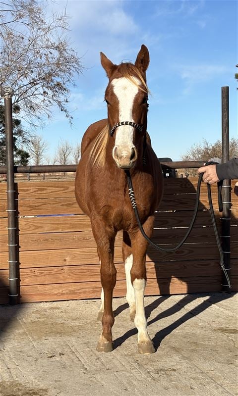 This guy is bred to be a barrel horse, and he’s going to look flashy doing it! Chrome, flaxen mane, and looks like he’ll probably express the rabicano gene. Very friendly and willing. Pasture raised with occasional stays in the barn for refreshers on basics. Stands right at 14 hands right now. Sire and dam are both tall, but this cross tends to produce a foal with less height, so as a guess I’d say he’ll finish closer to 15 hands. Paid in full to Future Fortunes and eligible to run at Colorado Classic and VGBRA. Current on deworming and feet, and has a current negative coggins.