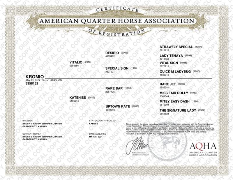 His dam, Kateniss, is by the great Rare Bar and out of a Race ROM producing daughter of Mitey Easy Dash. Kateniss was going in the barrel pen and roping pen prior to a career ending injury. Her oldest foals are in training and we’re getting great reports. This will be that last foal offered by her as we unfortunately lost her earlier this year.