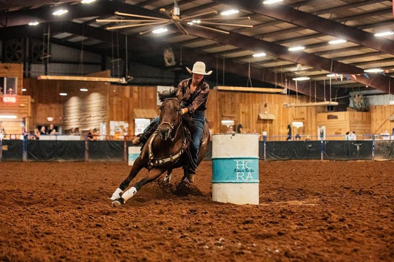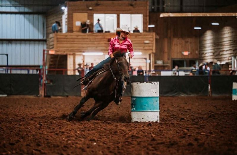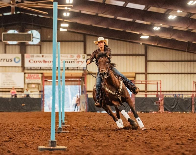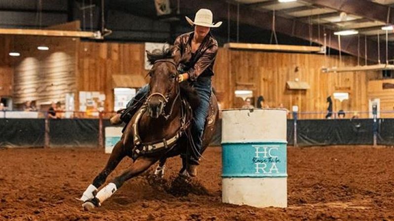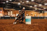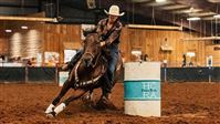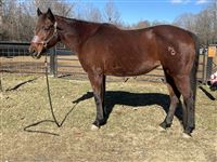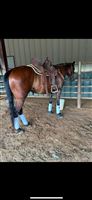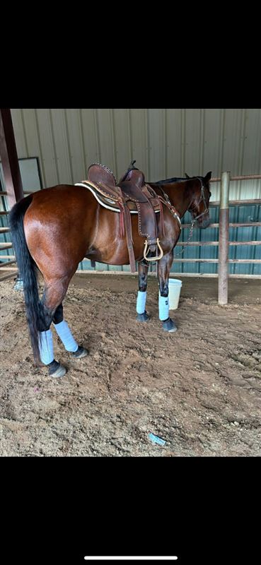 "MO" runs 2D-3D times consistently. Runs both Right & Left Patterns! Barrels & Poles! She has had a rope thrown off her (but she doesn't rope out of the box), pushes steers in return lane, gathers cows in the pasture, & ponies the yearlings. MO lives turned out with 2 ponies, a donkey, and 2 goats. VERY easy to get along with turned out and to handle. Light in the bridle, responsive to leg clues, & doesn't need endless exhibitions - MO knows her job and does it well, walks straight into the alley with zero hesitation. Personality Plus - Sweet, in your pocket, loves attention. Extremely easy to tack, bridle, and handle. In the Pasture, MO is bottom of the pecking order - Not a bully, gets along with others & is very easy to catch. Extras: MO will pull a sled, stands quiet for farrier, loads & unloads with ease, bathes like a Queen.