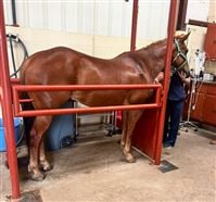 He can run cold or after a short warm-up and is very respectful in the warm-up pen. I’ve run him on Lasix a few times, but I feel he performs much better without it. No alleyway problems, he’s never refused and always trots in calmly.