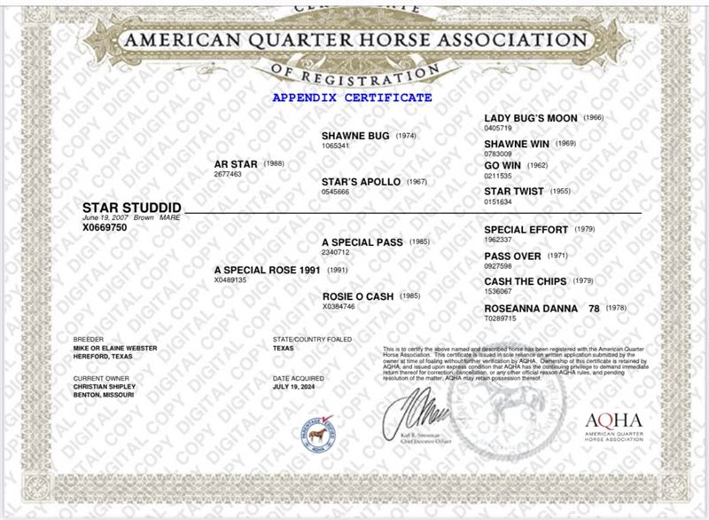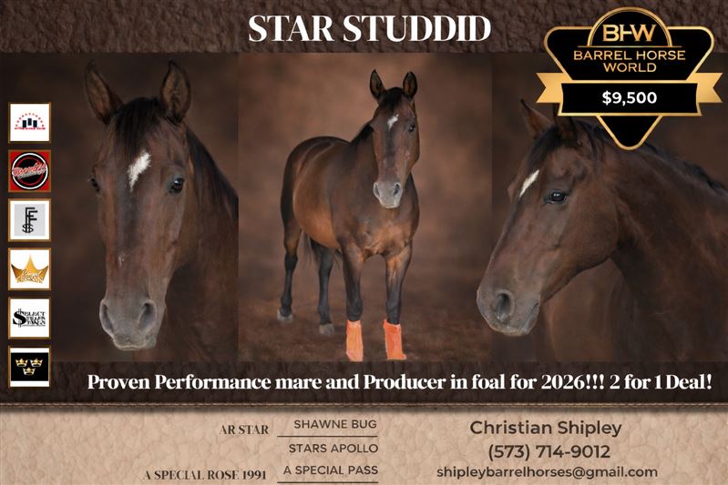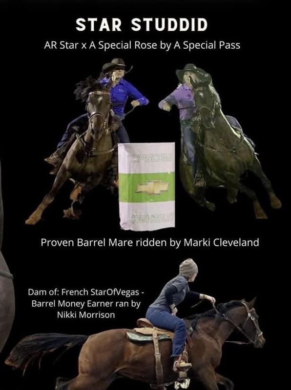 FOAL ELIGIBLE FOR BREEDERS CHALLENGE, FUTURE FORTUNES, TRIPLE CROWN 100, JR ROYAL CROWN, SELECT STALLION STAKES and MORE TO COME WITH THIS AMAZING YOUNG SIRE MANN ON FIRE! 2 IN 1 PACKAGE!!! Star Studdid “JLO” was a 1D performer prior to sustaining an injury to become a broodmare. She is broodmare sound only. Her offspring are very athletic and have a very nice style to them. Search “French StarOfVegas” to see some videos of one running 1D/2D. She is due the beggining of May and is an easy breeder and great mom. Only offering for sale because I have too many colts and mares due this spring so after a few sell the rest will be taken off the market. Foal is eligible for FF, BC, SSS, JRC, TC100 and lots more to come! Her sire Mann On Fire is not only GORGEOUS but extremely talented. Open, average 1D champion and multiple arena record setter. Located in Benton MO.