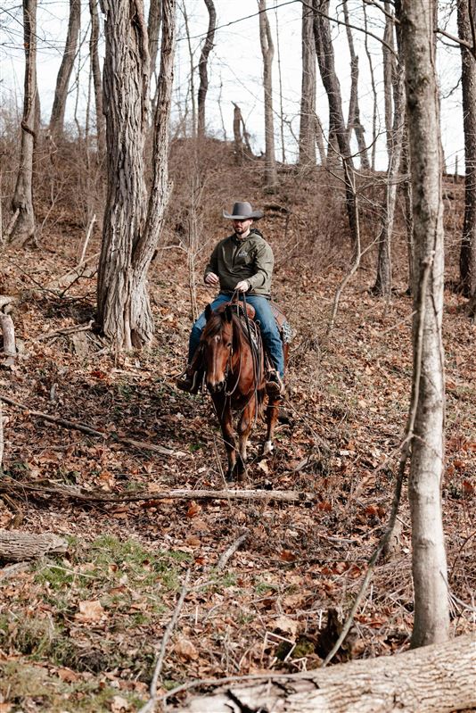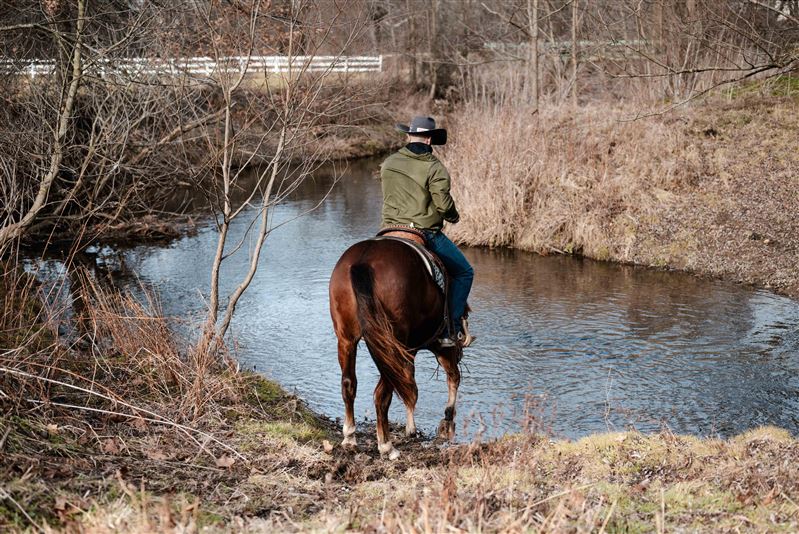 Roo stands quietly for the farrier and will ground tie until you tell him differently. He is the perfect size for a rider with bad knees, as he is easy to get on and off on the trail. He has been exposed to all farm machinery, equipment, road traffic, gunfire, deer, cattle—you name it. He is sound and up to date on teeth, vaccines, coggins, and health papers.