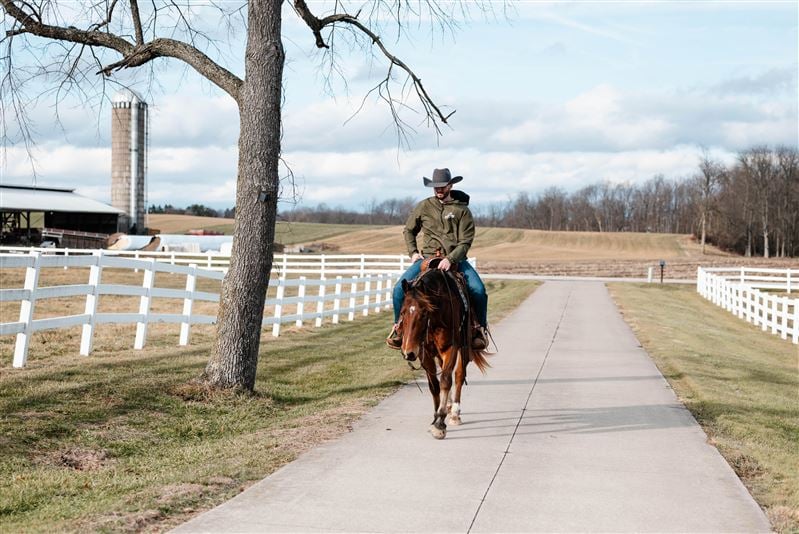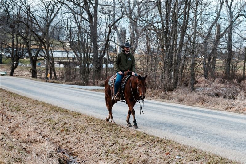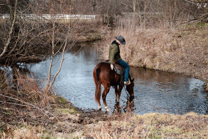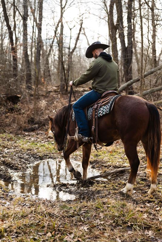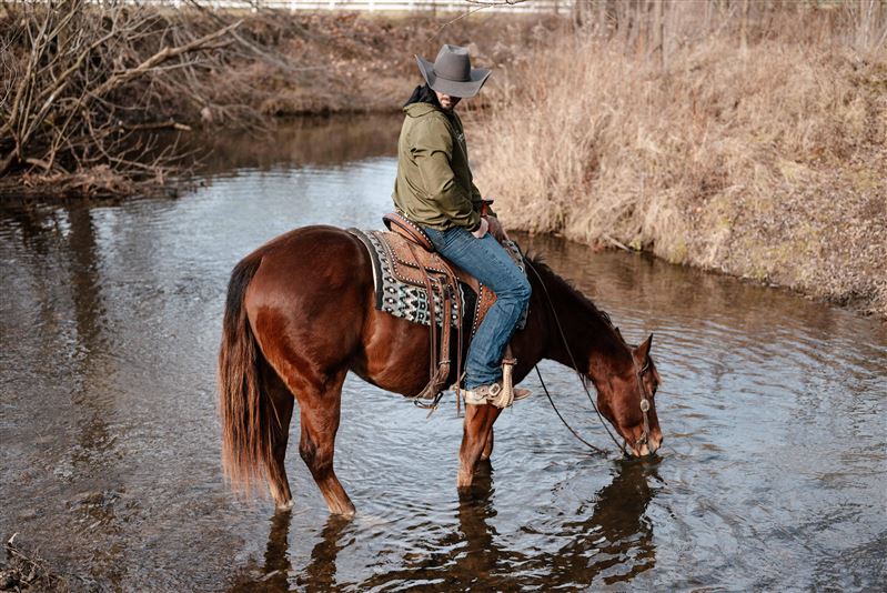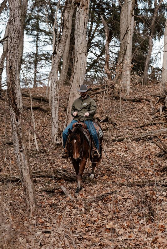 Roo has a one-handed neck rein and will move willingly off your leg cues. He has been hauled around the country and ridden in the arena, giving him a versatile handle. He gets along great with the other horses in the pasture and has no vices when pulling him out of the stall on Monday morning.