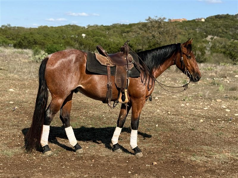 is a 4 year old bay roan gelding. I’ve done all of his training, he is solid. Was an exceptionally easy colt to start, he loads and backs out, stands tied like a statue, picks up his feet, saddles and bridles quiet.