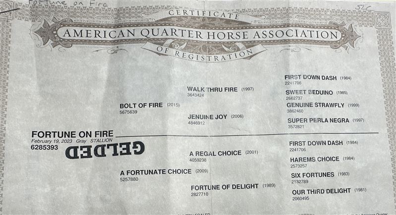 Sired by Bolt Of Fire, an undefeated son of Walk Thru Fire, and out of A Fortunate Choice, a graded stakes-placed mare and earner of over $65,000 on the track, “Fortune On Fire” offers proven speed bloodlines combined with a great disposition and trainability. A top-quality young prospect with a bright future in the arena.