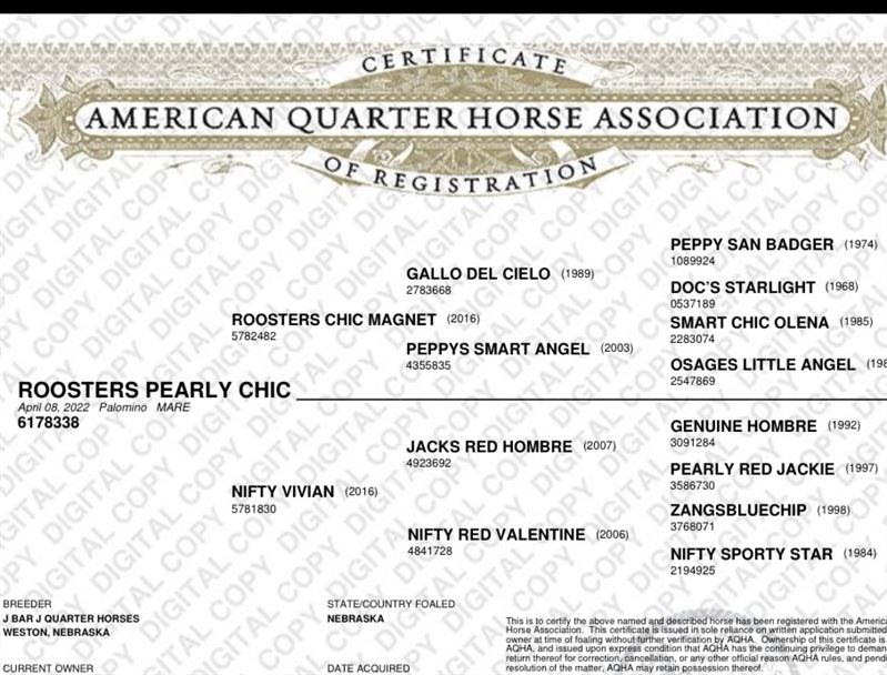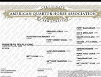 Her sire is ROOSTERS CHIC MAGNET, 28.5 AQHA points: AQHA High Point Senior Performance Halter Stallions Leader; Open Perf. ROM. Sire of ROOSTERS CHEXY CHIC (6th lowa Ranch Horse Extravaganza Futurity Yearling Ranch FUNDAMENTALS Open). His first foals arrived in 2022. Her dam is NIFTY VIVIAN. Dam of 2 foals. Maternal grandsire is JACKS RED HOMBRE; sire of 5 money-earners, including JACKS TUF HOMBRE (11 AQHA points: ARHA World Senior Open Ranch Trail Champion), JACKS STAR HOMBRE (26 AQHA points: