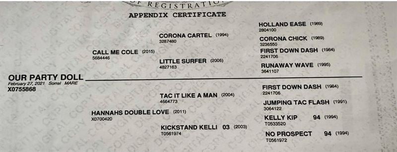 Our Party Doll is an exceptionally well-bred young mare that combines proven race genetics with outstanding potential for the barrel pen and future production. She is sired by Call Me Cole ($298,122), a son of the legendary Corona Cartel, and out of a race-winning daughter of Tac It Like A Man, giving her a powerful pedigree suited for both speed and performance disciplines.