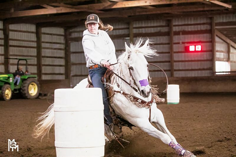 Off the pattern, she is very broke. Drills the barrels well at home and is great and safe on the trails. Hartley is wonderful to be around, and great with everything you ask, hauling, farrier work, vet work, etc. She is good to be around other animals, cattle, goats, dogs, etc. Hartley can get a little on the muscle before runs and while drilling, but nothing unsafe and out of control.