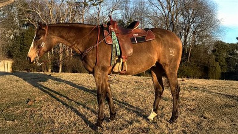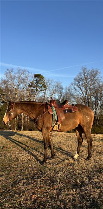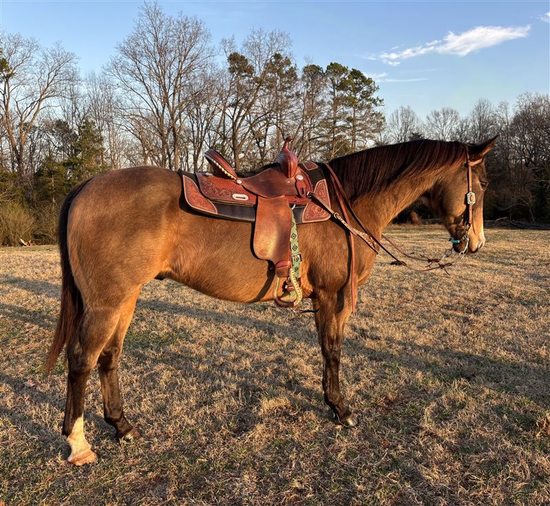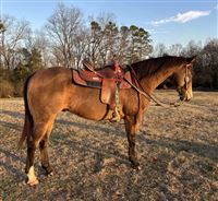 Maverick is a 14 year old gelding who is looking for a new person to love. 15 hands beautiful dark buckskin. Maverick is an excellent trail horse who also does play day events such as barrels and poles. Youth approved. He was used as a lesson horse in the past. Maverick hauls great, he is easy to catch and super sweet. He gets along with mares and geldings and does fine in the pasture by himself as well. Current on coggins and vaccines. Wears front shoes only with pads. If you want to take him back to the barrel pen he may need to be injected to perform at his best level. He was running solid 3D times when he was hauled. Current owner is off to college and not able to spend as much time with him. Text 704-284-1572 for videos and questions.