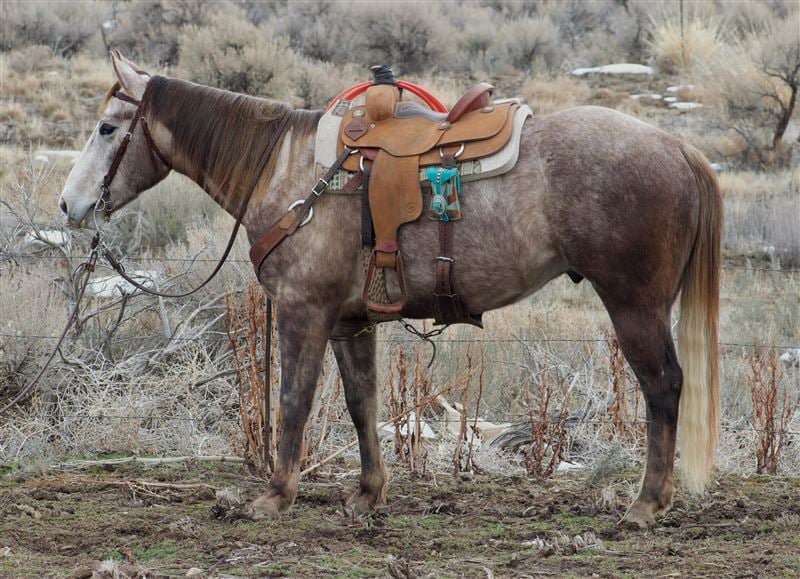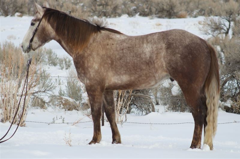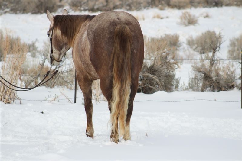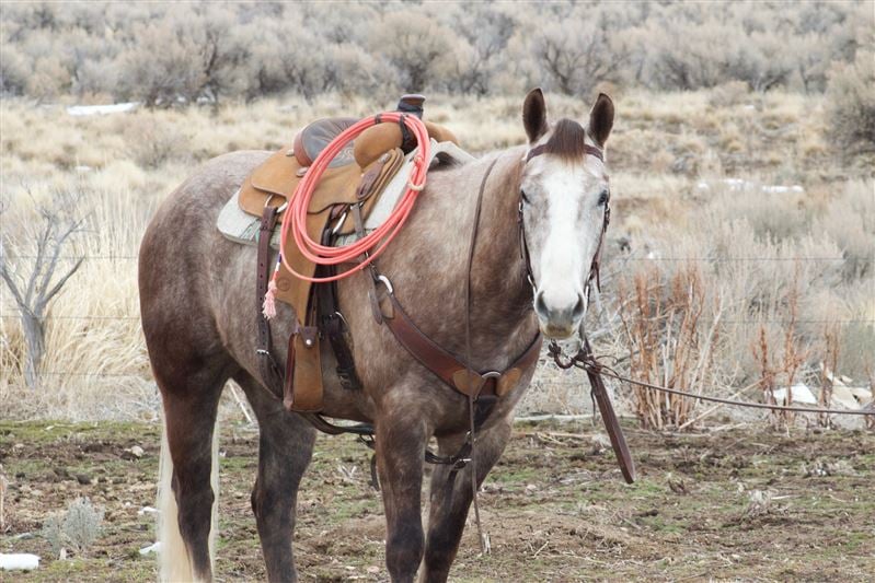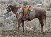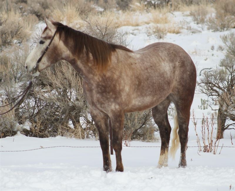Used for light ranch work. He travels great outside and is cowy. We’ve hauled him on over night stays and exposed him to all the commotion at events. Trailers well, hobbles, easy to shoe, UTD on vaccinations and dental.