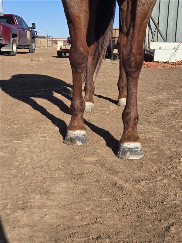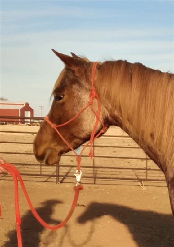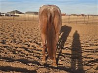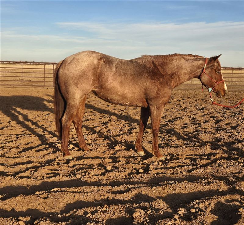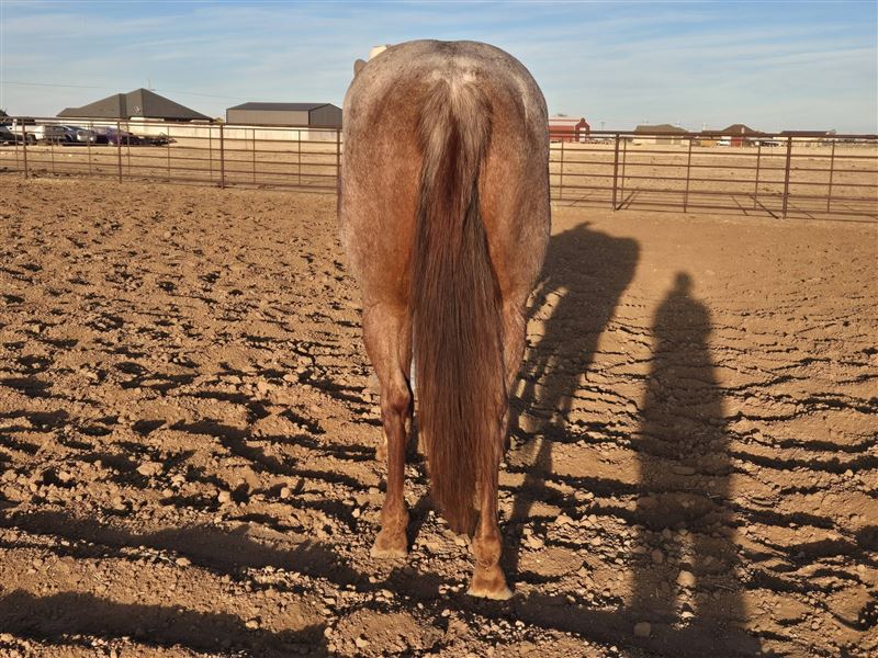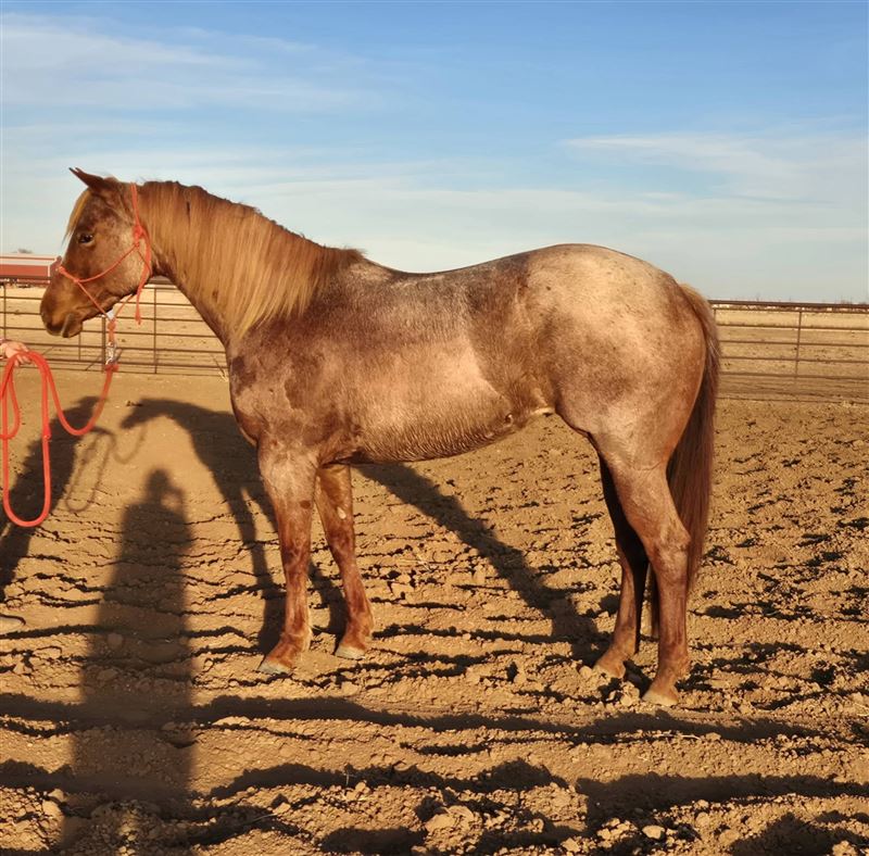 Kitty is a really nice 5 year old mare we are offering to the public. She is by Meteles Cat out who is a NCHA Hall of Fame stallion with earnings of $437,016, marking him one of the cutting horse most distinguished horses. She is out of a daughter of Mr. Jess Perry who has won one over $687,000 on the track and has produced earners of over $53.9 Million. Kitty is broke well, super sweet, built big and thick. We have started heading on her and she is taking to it like a pro. She is also patterned on the barrels. She is cow bred and running bred which is a great combination. She is a pretty strawberry roan. Can be paid into the Riata Buckle, Royal Crown and the Gold Buckle. Don't miss out on this nice mare. Asking $2X,XXX. No trades!