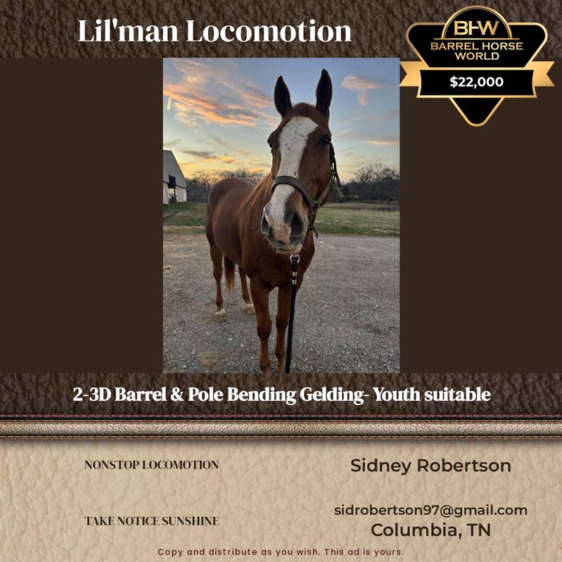 Lil'man Locomotion aka Lil'man is a 16hh 2011 barrel and pole gelding. He runs 2/3D open barrels in middle TN and 22/23 sec poles (limited pole entries). Was NBHA year end Reserve Open 3D Champion in 2025.