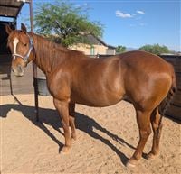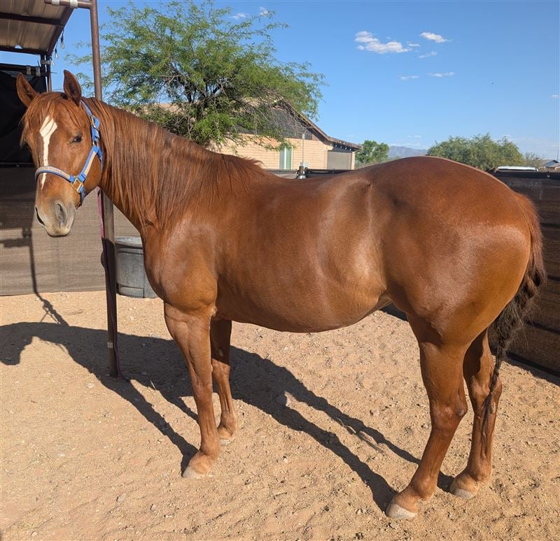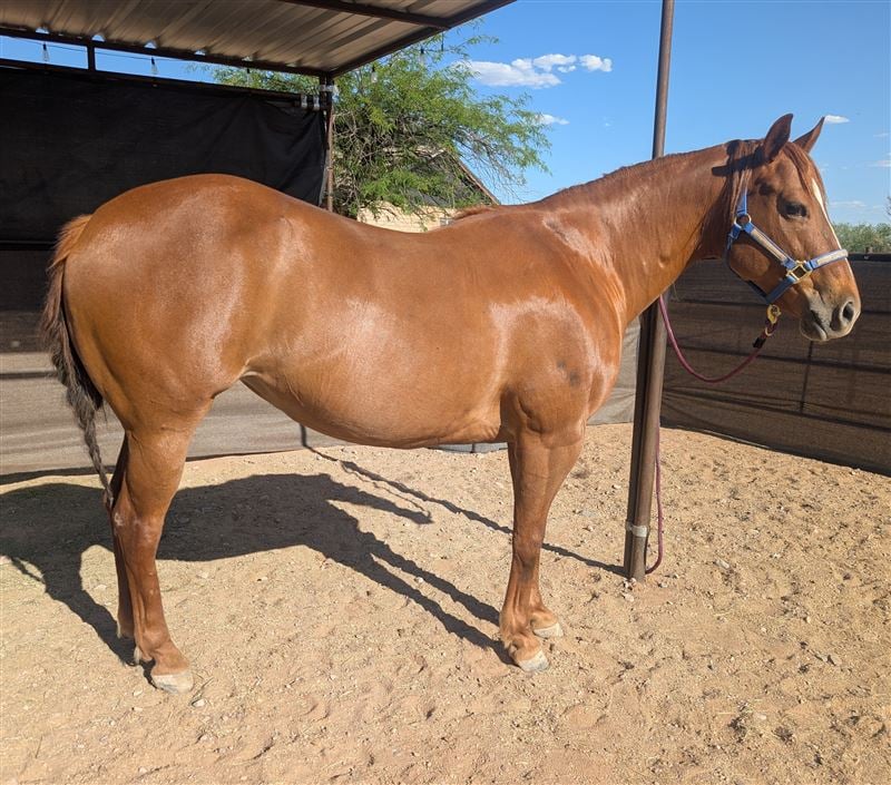 Snapdragon is an incredibly friendly, sweet mare. She had all the potential to be a champion barrel horse but was injured as a 2 year old. She is still sound for light riding but can't race without pain. Stands for farrier, loads, ties.
