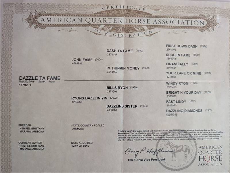 Sire is John Fame, producer of many winning barrel horses. Dam is Ryons Dazzlin Yin (Windy Ryon/Streakin Six bloodlines) who was a solid 1D & pro rodeo money earning barrel horse.