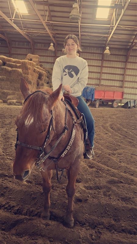 Anyone can trail ride this mare, pasture, arena ride is great. All the buttons and a great personality. Not a buddy buddy horse she's fine hanging out by herself, but she's not a B w others. Ties to trailer all weekend, stalls, no probs hauling whatsoever.