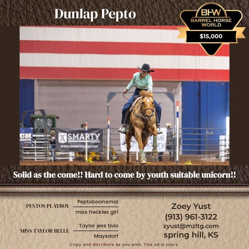 Very much youth suitable! He’s not a pony ride horse as he is a high caliber barrel horse but would be a killer junior high horse or step up horse. Disco is great in the gate, easy to slow work, fancy broke, and easy in the pattern. I have loads of videos and will tell you any information you want. Normal barrel horse maintenance nothing crazy, he is amazingly sound for his age. PPE welcome at buyer expense. This is not an easy decision for me I just have lots of horses and he has so much life in him he needs his next cowgirl to spoil him and love him as I have. I will not be upset if he stays we just want the perfect home!