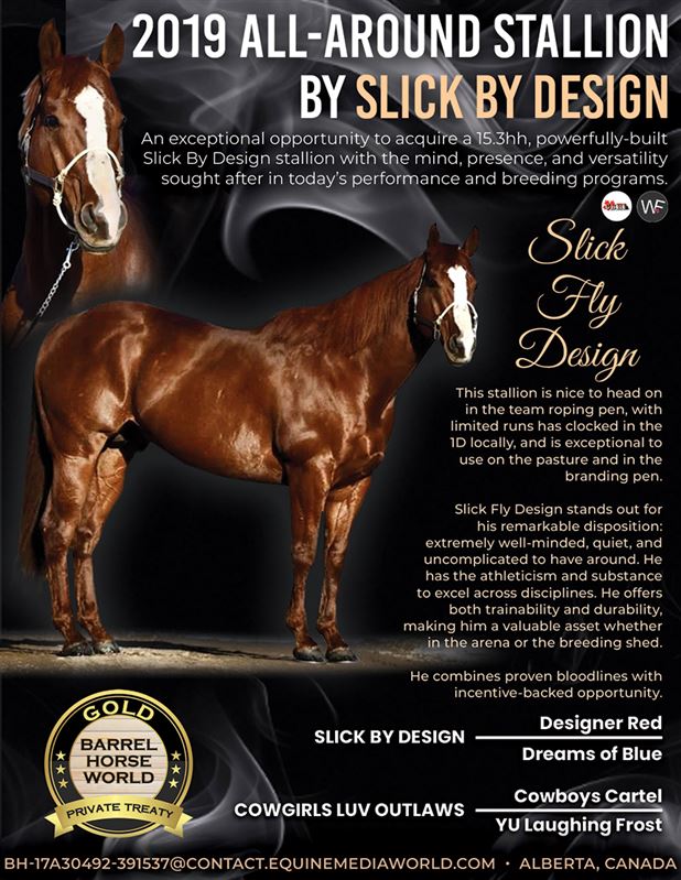 An exceptional opportunity to acquire a 15.3hh, powerfully built Slick By Design stallion with the mind, presence, and versatility sought after in today’s performance and breeding programs. He is nice to head on in the team roping pen, with limited runs has clocked in the 1D locally, and is exceptional to use on the pasture and in the branding pen.